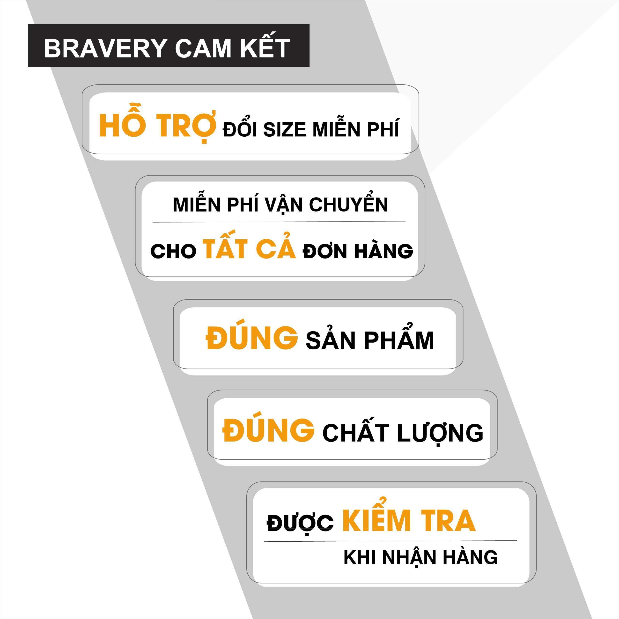 Ra đời với mong muốn mang đến cho khách hàng những trải nghiệm mua sắm tốt nhất, các sản phẩm của Bravery khi gửi đến khách hàng luôn được đảm bảo là hàng nguyên mới, chất lượng, đúng với thông tin mô tả và hình ảnh trên website.